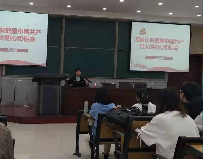 冯淑霞结合党的十八大、十九大以来习近平总书记在系列讲话中谈到的我们党的初心和使命,从“何为不忘初心、牢记使命”、“为何不忘初心、牢记使命”、“永葆共产党人的初心和使命”三个方面,详细阐述了中国共产党从最开始的58名党员发展到如今9000多万名党员的伟大历程,并指明马克思主义发展观的核心是坚持人民至上,所以无论何时何地,新时代下的共产党员都要时刻铭记“为中国人民谋幸福,为中华民族谋复兴”的初心和使命。