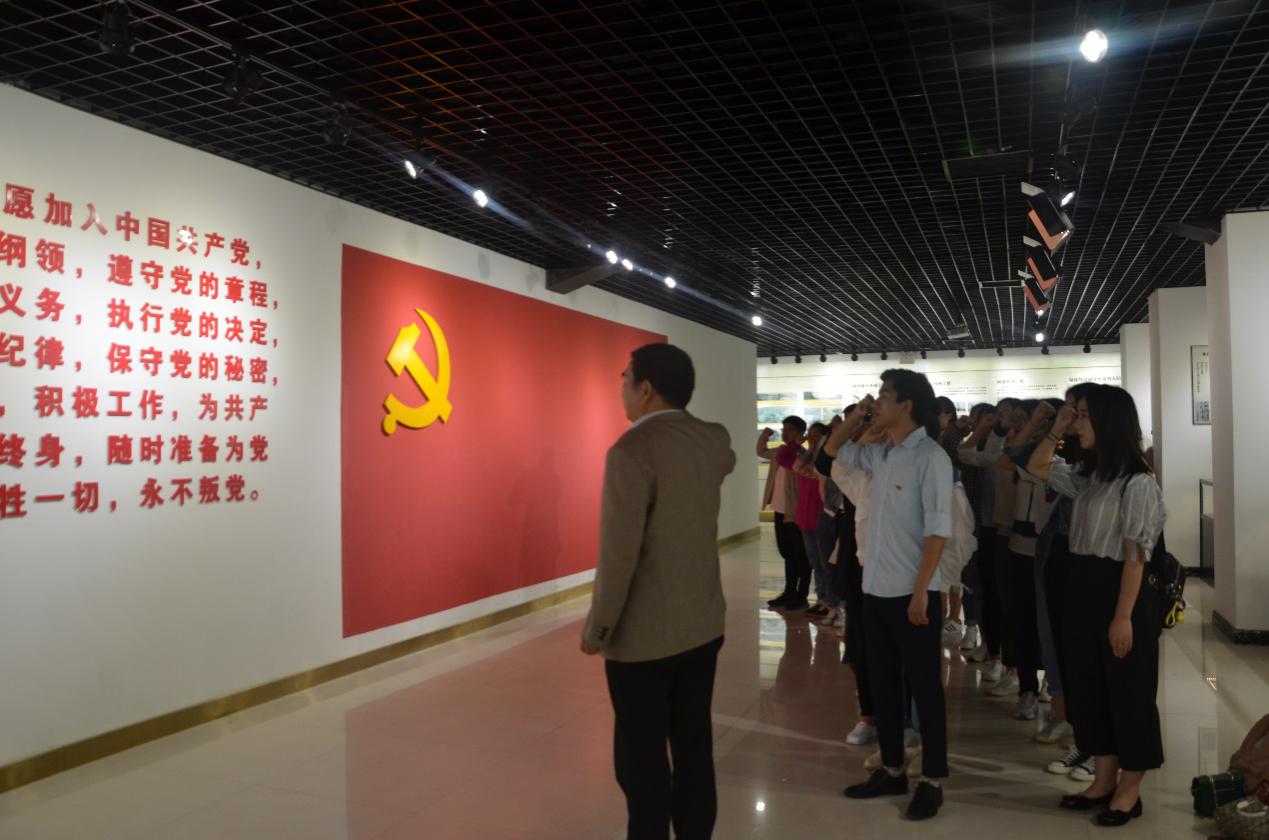 在讲解员声情并茂的讲解下,大家怀着崇敬的心情,详细参观了治淮精神陈列馆。一张张泛黄但栩栩如生的照片,一件件历经沧桑但饱含故事的文物,广大党员与积极分子仿佛重新置身于灾难深重但激情万丈的历史中,纷纷被伟大时代的伟大精神深深震撼,被先进人物的事迹深深吸引。信念坚定、对党忠诚、担当作为、干事创业,是一代代淮医人的真实写照!把理想信念化为行动力量是一代代淮医人干事创业的激情。活动最后,全体党员面向鲜红的党旗,重温入党誓词!
