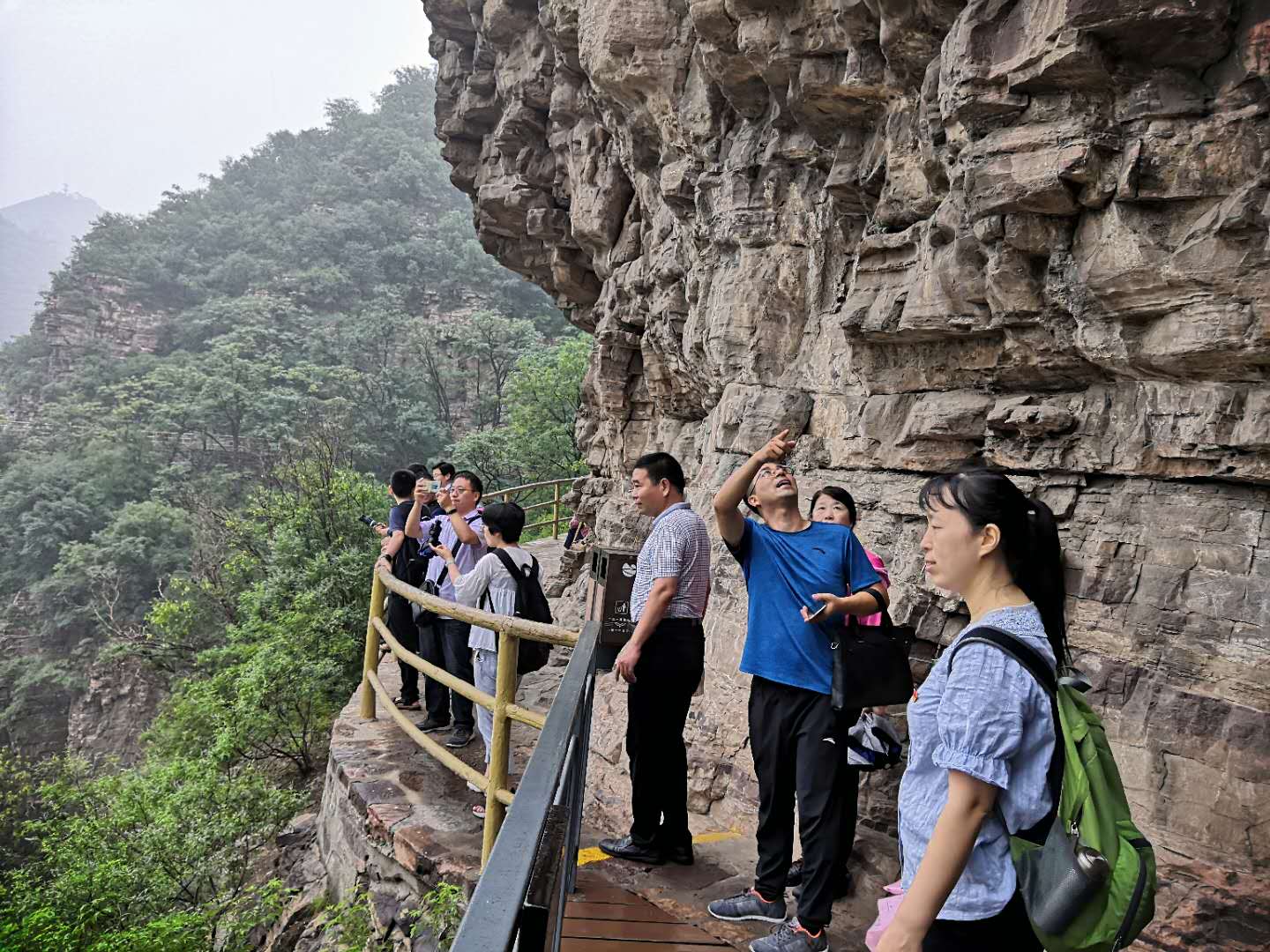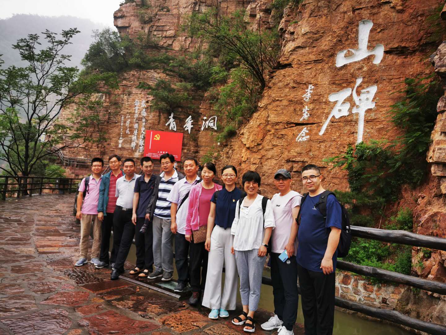 在蒙蒙细雨中,大家首先沿着红旗渠总干渠走过团结洞、创业洞,到最长的隧洞——青年洞,深切感受到了当年林州人民凿山穿洞之艰难,红旗渠修建之不易。青年洞从地势险恶,石质坚硬的太行山腰穿过。原洞长616米,高5米,宽6.2米。1960年11月,因自然灾害和国家经济困难,总干渠暂时停工,为早日将浊漳河水引入林县,建渠干部群众坚持“宁愿苦战,不愿苦熬”,由各公社挑选300名青年组成突击队,继续施工。当时干部民工口粮很低,为了填饱肚子,上山挖野菜,下河捞草充饥,很多人得了浮肿病,仍坚持战斗在工地,以愚公移山精神,终日挖山不止。经过一年零五个月的奋战,1961年7月15日凿通隧洞。为表彰青年们艰苦奋斗的业绩,将此洞命名为“青年洞”,全国人大常委会副委员长郭沫若亲笔题写了洞名。在青年洞前,面对鲜艳的党旗,和江泽民同志“弘扬自力更生、艰苦创业的红旗渠精神”的巨幅提词,全体党员庄严地举起右手,再次齐声重温入党誓词,立志不忘初心、发奋努力,为学校增光,为spbo即时比分手机