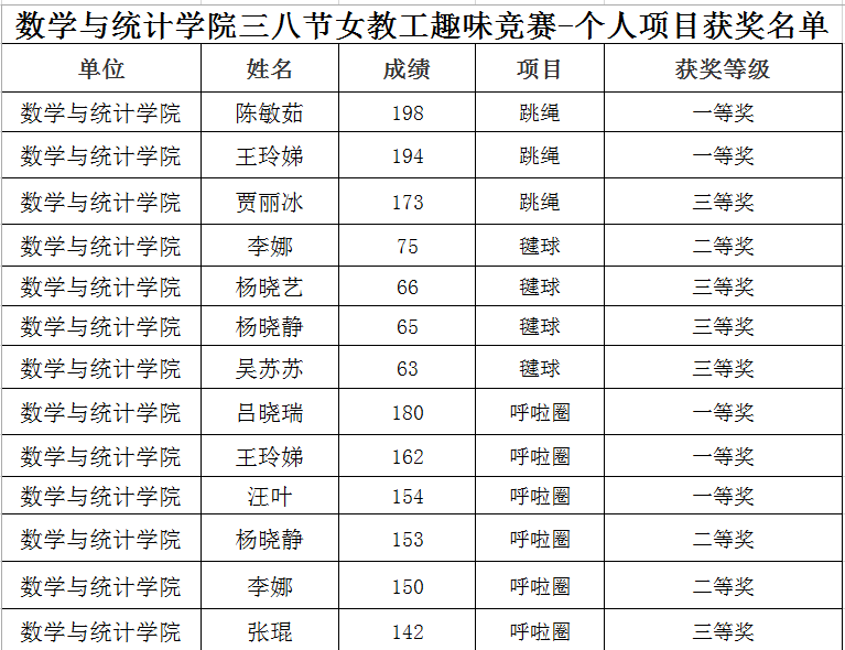 教职工团结一致、勇于拼搏的精神风貌,并荣获三等奖。在键球、跳绳、呼啦圈等个人项目中,我院女教工踊跃参赛,展现了“巾帼不让须眉”的风采和自尊、自信、自立、自强的精神风貌。