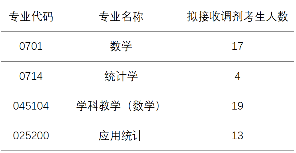 我院2023年数学(0701)、统计学(0714)、学科教学(数学)(045104)和应用统计(0252)四个专业均有部分缺额,具体详见下表。