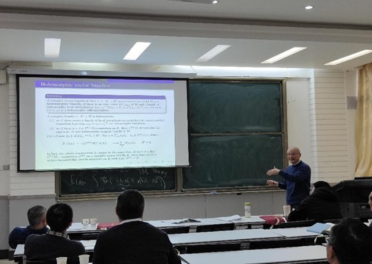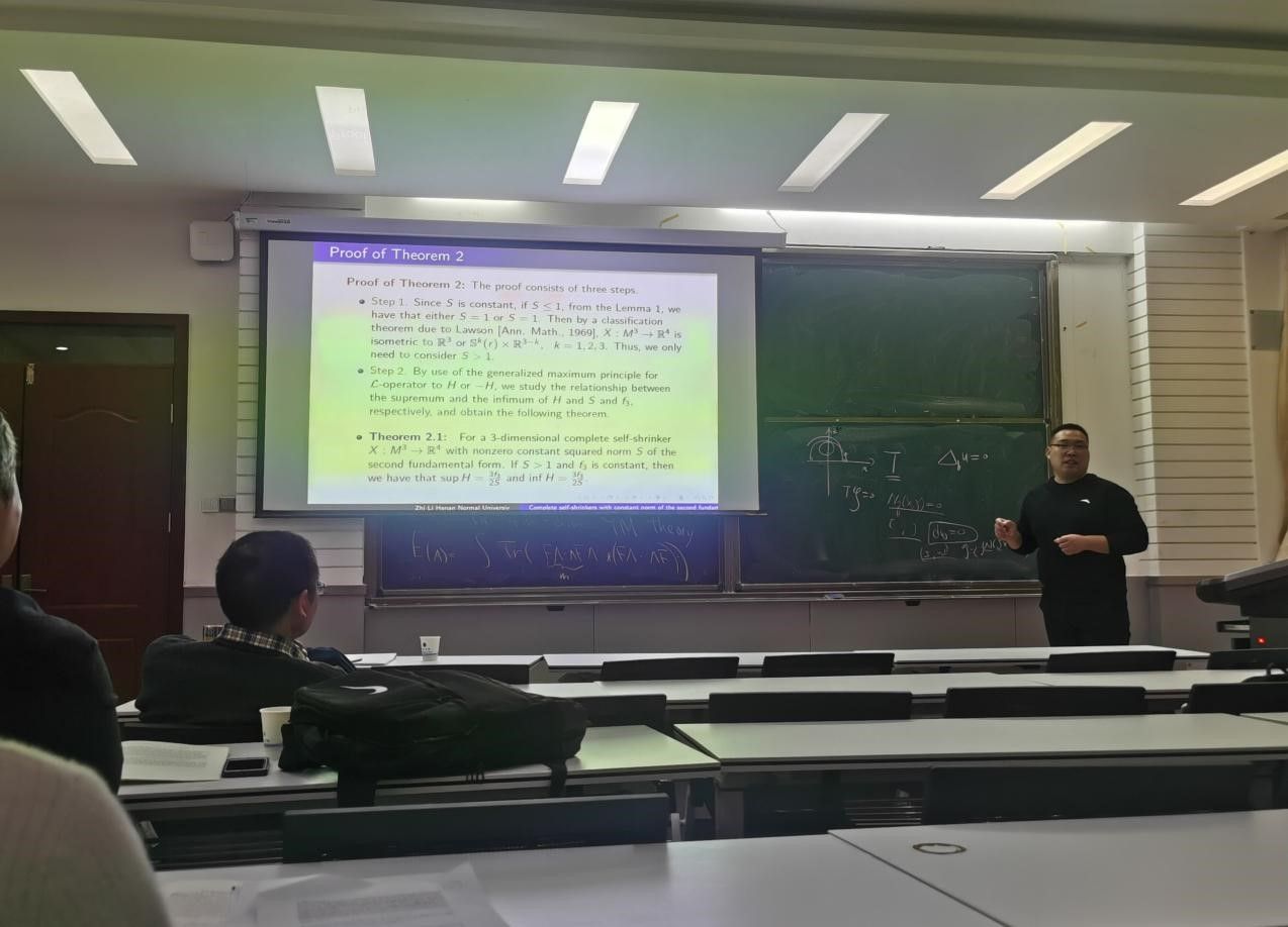 主办。本次年度会议主要围绕微分几何与复几何等领域中的前沿问题进行学术报告和交流研讨,旨在加强学术同仁之间的交流与合作。本次会议邀请的有重庆理工大学、台湾大学张树城教授,纽约大学杨亦松教授,郑州大学胡泽军教授,北京大学、河南大学特聘教授刘张炬教授、河南师范大学黄广月教授、信阳师范大学韩英波教授等30余位专家学者参加。