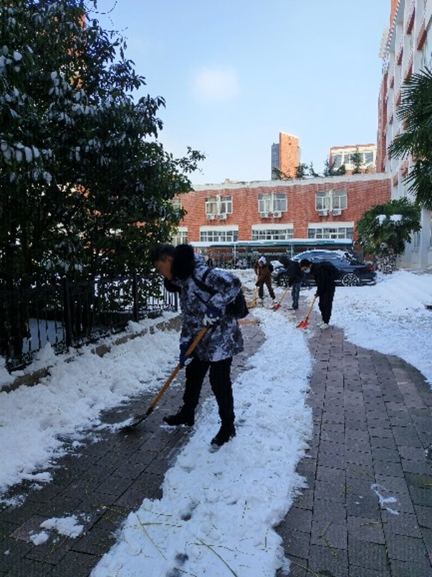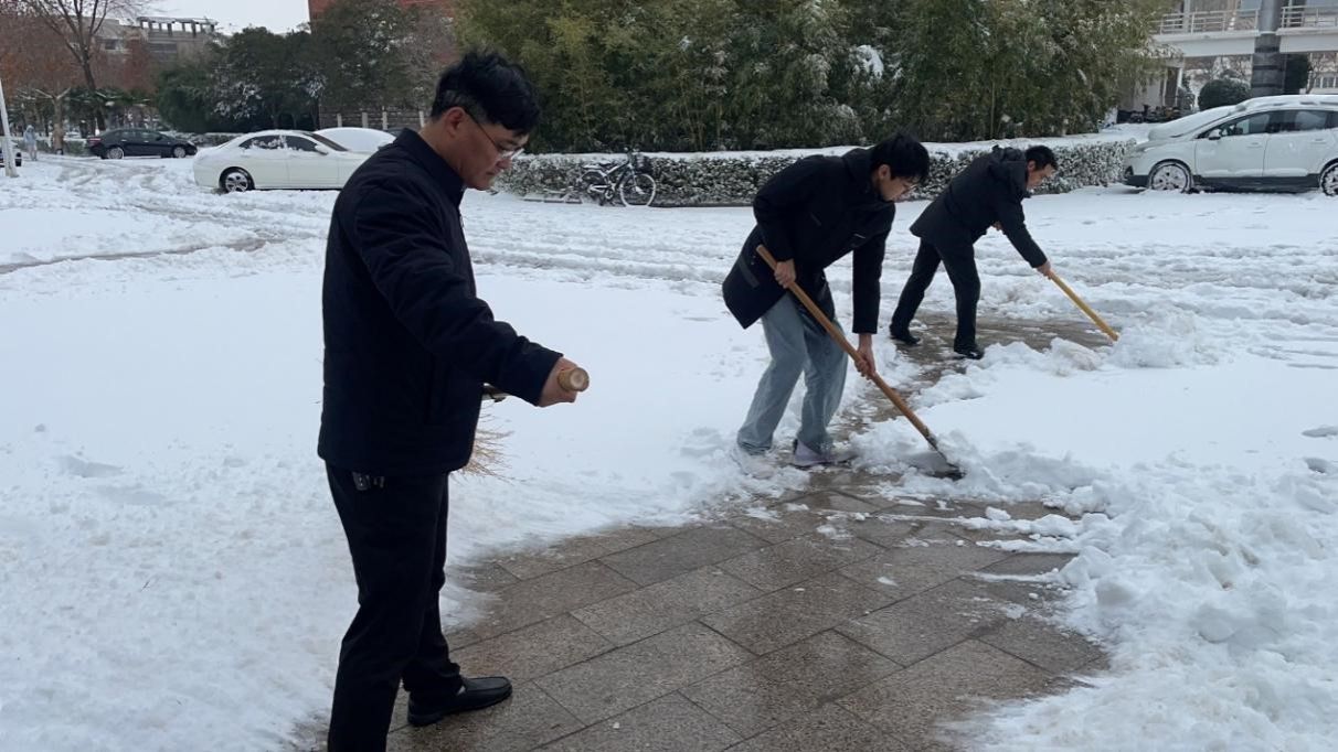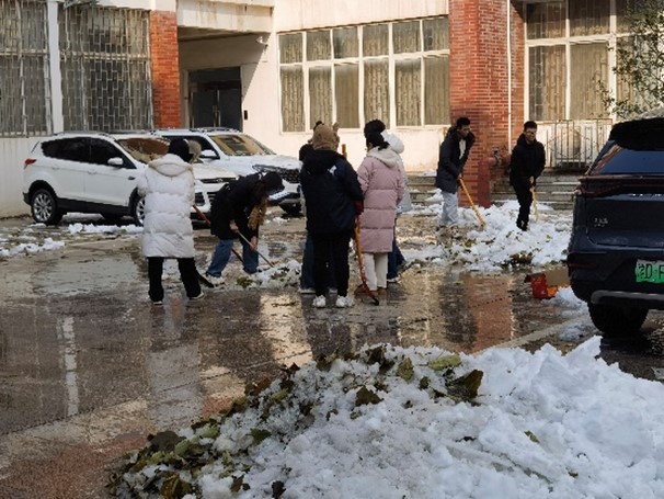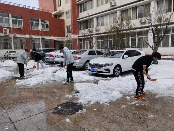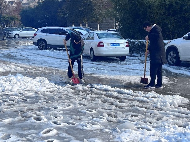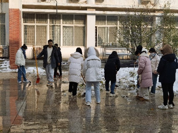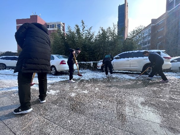 党委书记曹志伟、副院长杨一平等老师带领本科生、研究生50余名同学们进行铲雪除冰志愿活动。