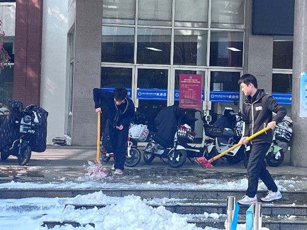 在凛冽的寒风中,同学们尽管手脚冰冷,但铲雪的动作丝毫不慢,依旧认真细致,通过不懈的努力,地上的积雪渐渐清理干净,露出整洁的路面。冬天的温度无疑是寒冷的,但是志愿者的内心是火热的,他们用自己的行为给河大学子们带来了温暖,保障了大家的出行安全。