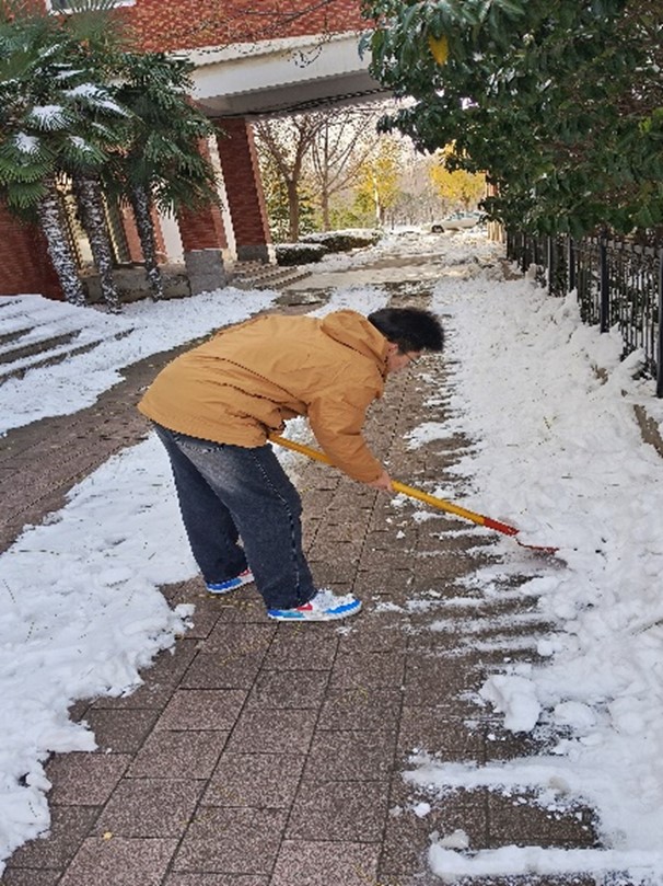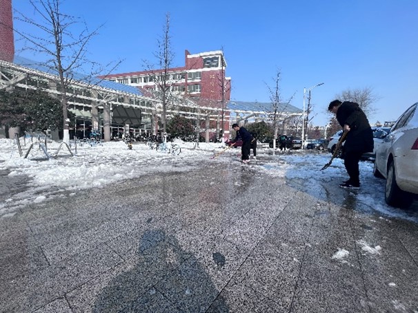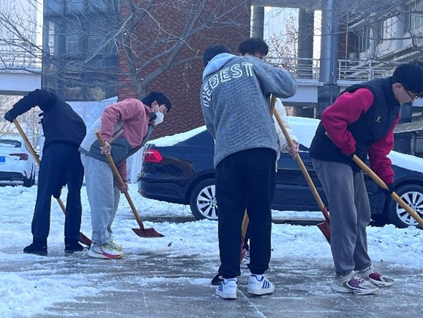 严寒的天气抵不住同学们的热情,老师们带头在前,学生们紧随其后,他们挥舞着铁铲,全身心投入到扫雪破冰行动中。大家不畏严寒、积极主动、分工合作,忙碌的身影形成了白雪中靓丽的风景线,入冬的天气虽然寒冷,但大家劳动的热情和满满的干劲丝毫没有减退,脸上洋溢着的灿烂笑容为寒冷的冬天增添了一抹暖意。