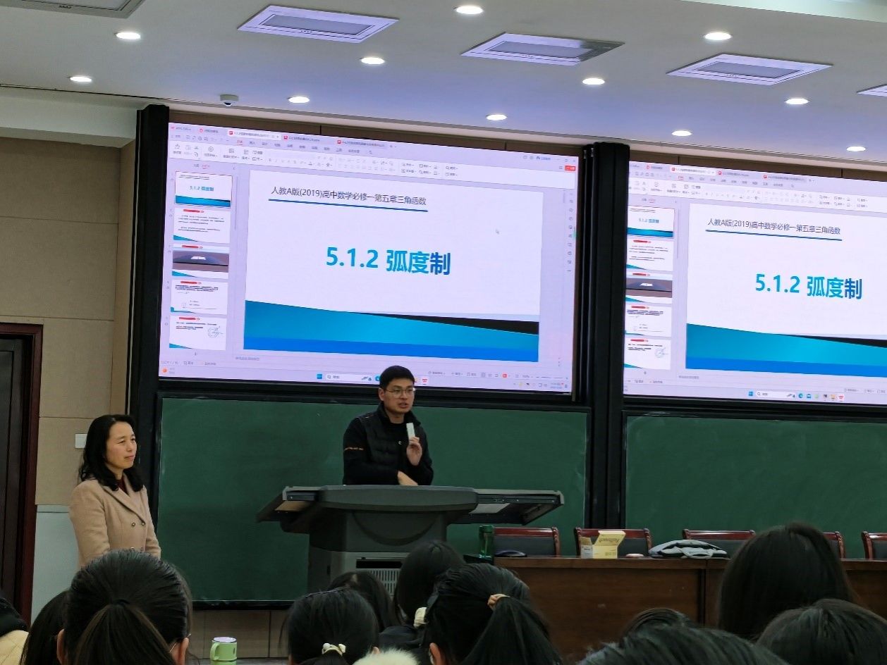 第二场教育见习活动为2023年12月20日举行的教学名师辅导报告活动。邀请了河南大学附属中学的张满义老师做了题为《新课程标准下《弧度制》的设计分析与课堂展示》的报告。学科教学(数学)专业2023级研究生、数学与应用数学专业2022级本科生参加了报告会,报告会由张玉环老师主持。