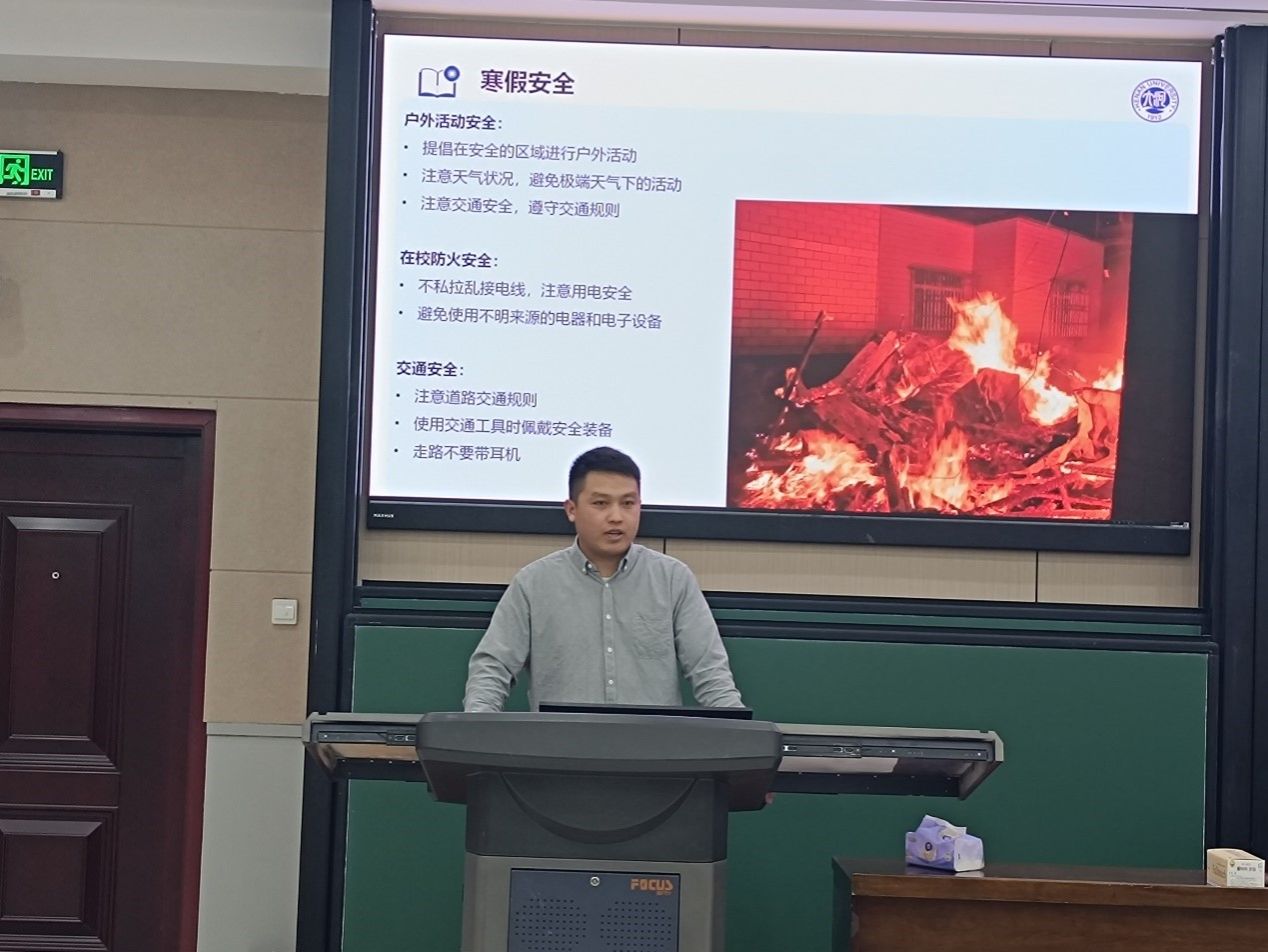 最后,寒假来临,陈顺杰老师强调了假期的安全问题,提倡在安全的区域进行户外活动,并避免在极端的天气下活动,同时他强调时刻树立安全意识和自我防护意识,始终牢记“安全第一、预防为主”的思想,提高自我警惕性,合理安排自己的假期生活。