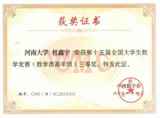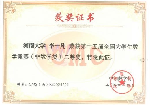 李望龙以河南省第一名的好成绩获得专业组(高年级组)二等奖;杨桂颜、韦萍萍、代维嘉、杜鑫宇获得专业组(高年级组)三等奖;巩启超获得专业组(低年级组)三等奖;李一凡获得非专业组二等奖;郑广豪、屠玉涛、周柄材获得非专业组三等奖,河南省数学会获评“优秀赛区组织奖”;河南大学获评“优秀高校组织奖二等奖”。