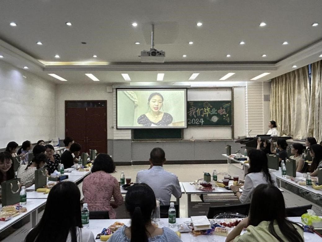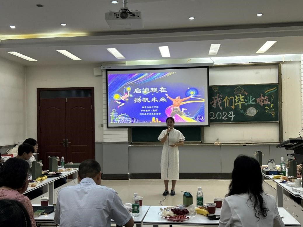 2024届学科数学代表周佳慧用一段视频,表达了对研究生生活的不舍和对学弟学妹们的期盼。在校研究生代表王海瑞发言,感谢学长学姐们分享的宝贵经验,祝福学长学姐们杨帆未来,前途似锦!