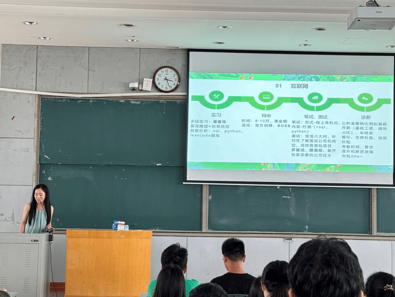分享会上,高心怡和路佳琪强调了职业规划和实习经历的重要性,建议学弟学妹们尽早明确职业目标,多积累实习经验,提升竞争力,并在面试时深挖项目经验和公司信息。王浩分享了公务员考试方面的经验,建议先了解岗位详情,再选择适合自己的岗位,并考虑参加多个地区的公务员考试,以增加成功率,同时,在备考期间也要积极寻找其他工作机会。郭鹏浩等人介绍了考博升学需要关注的重点,强调了科研能力和申请材料的准备,包括研究计划书和推荐信,鼓励大家把失败看作下一次成功的准备。贾莉莉等人分享了考取教师编制的成功经验,建议提早准备,深读课本,关注招聘信息,面试时注重教学流程并且要表达清晰。