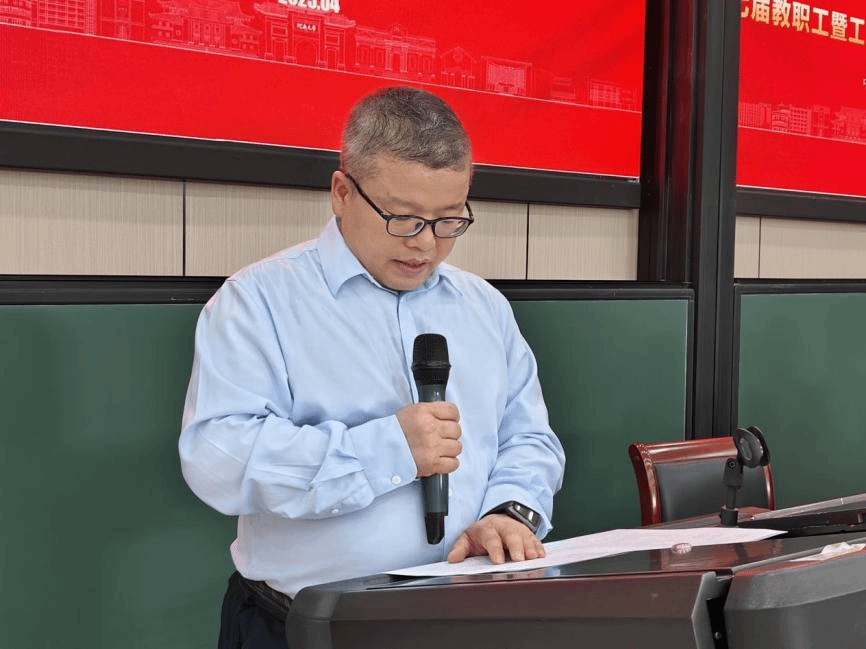 全体教职工参加会议,校工会副主席徐飞应邀出席会议并致辞。
