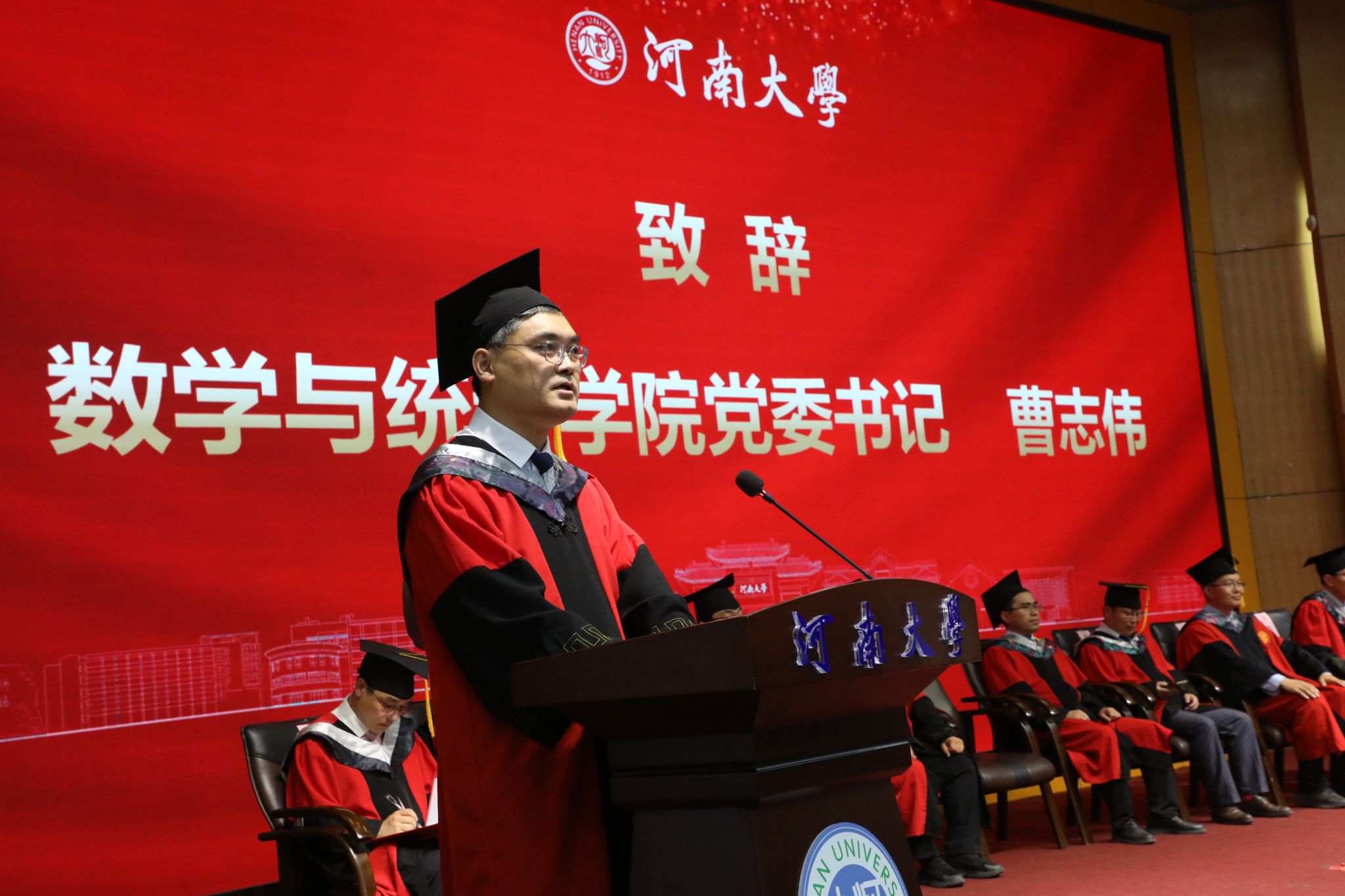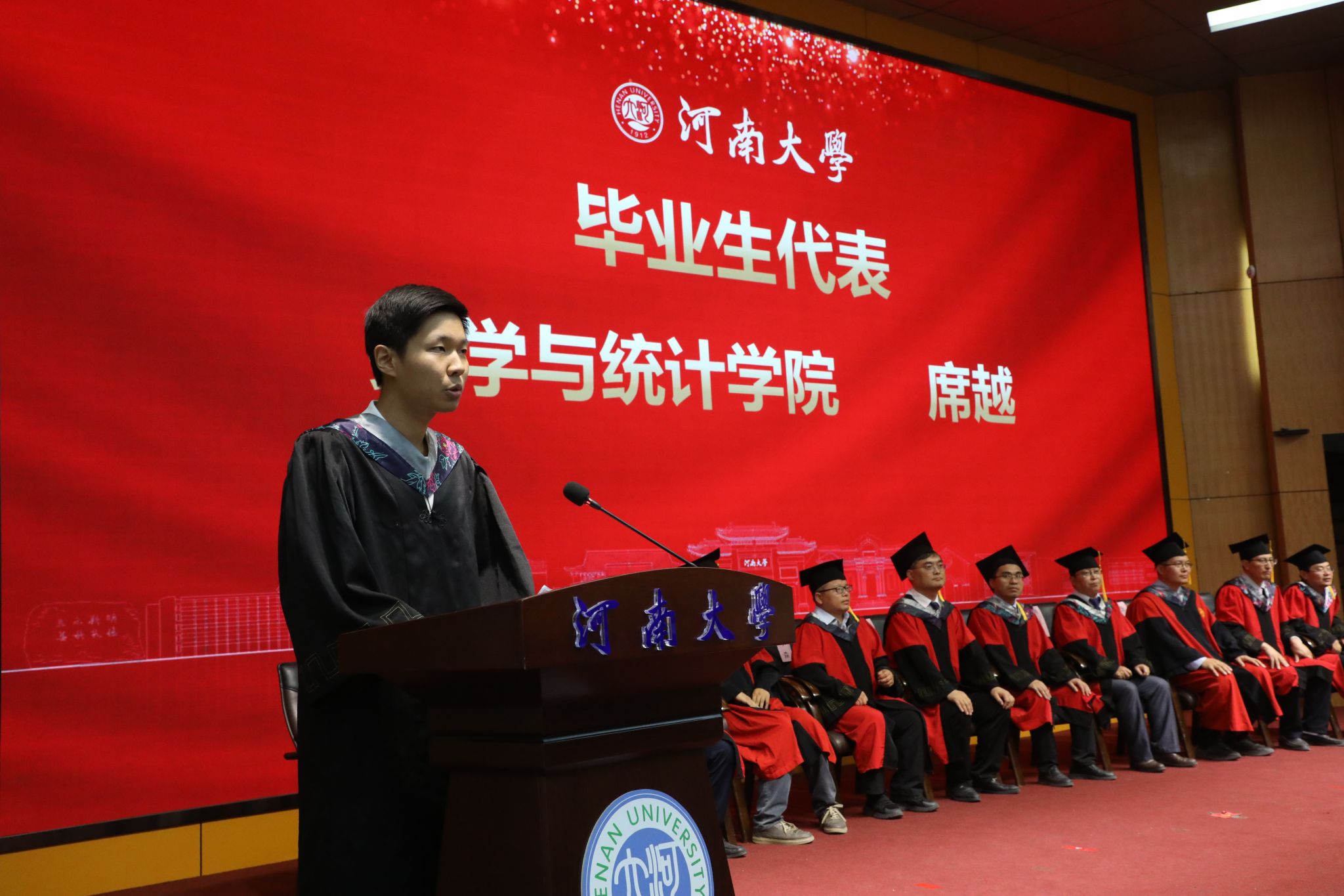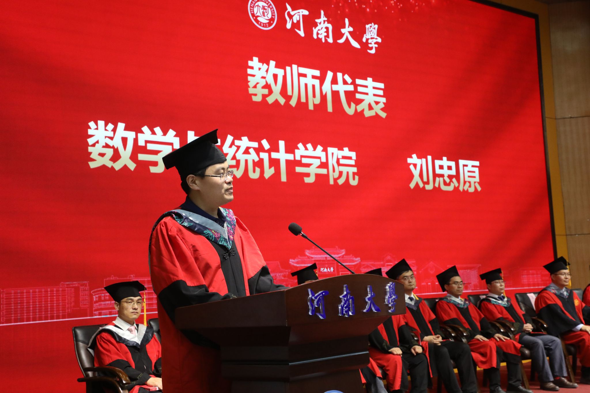 教师代表刘忠原结合自身经历,勉励毕业生们要心怀家国,将个人发展融入时代洪流,以数学人的方式服务社会、报效祖国;要勤于思考、善于发现问题并保持判断力;要用数学的坚韧和解决问题的智慧应对不确定性,坚持学习、锚定热爱。最后,寄语毕业生们用数学智慧照亮前路,用河大人的担当书写绚烂人生。