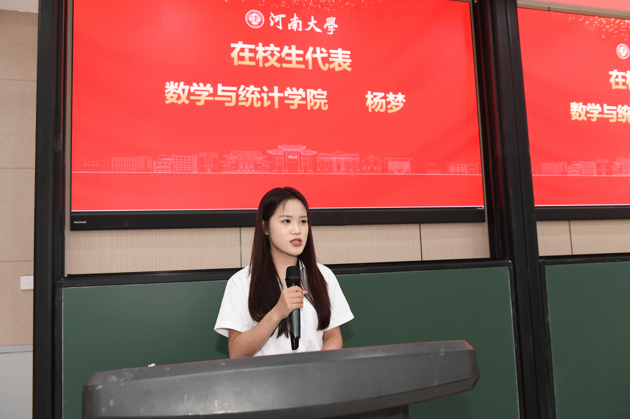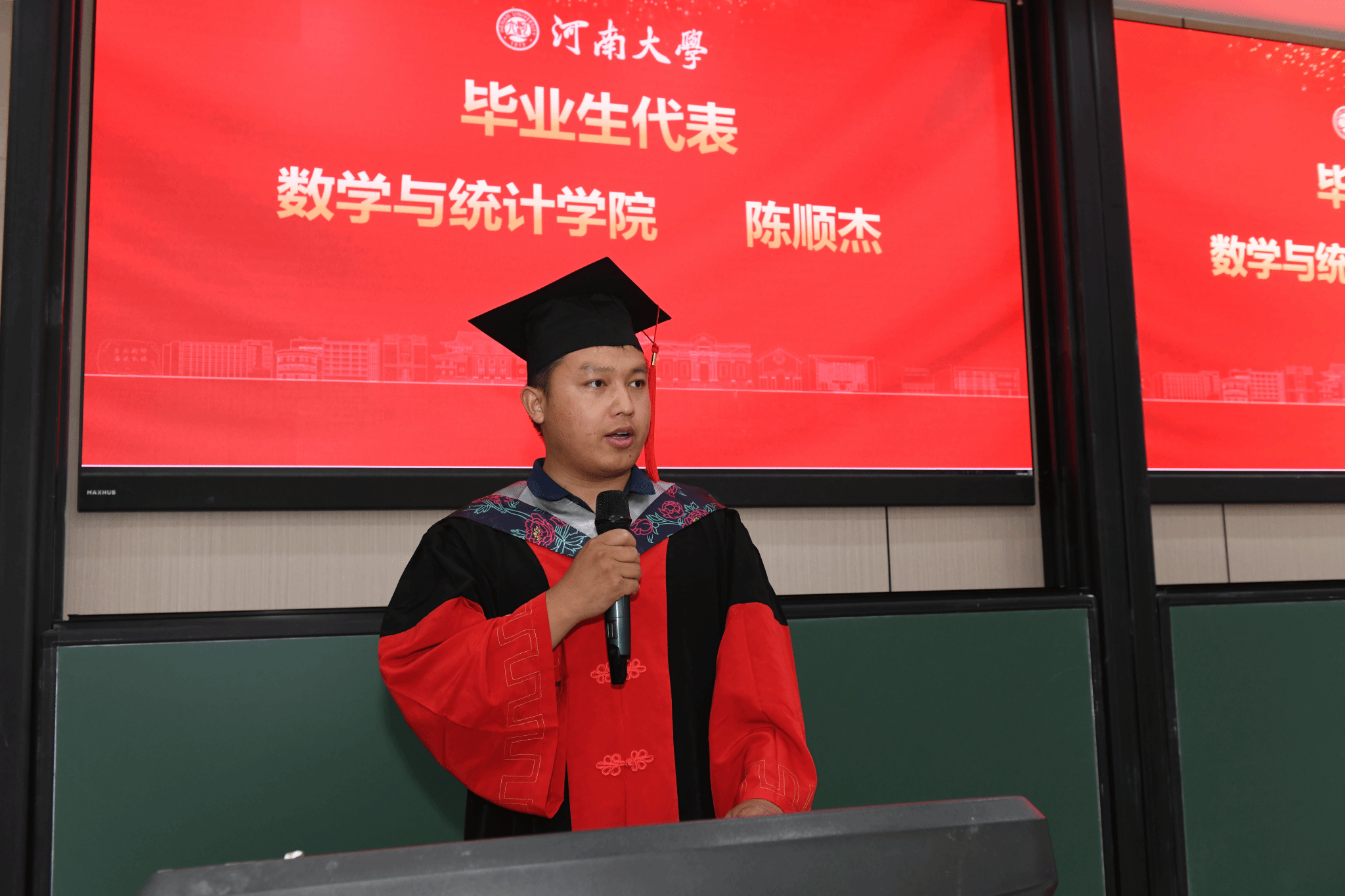 毕业生代表陈顺杰深情回顾了求学岁月。他感言,在无数与定理公式相伴的日夜中,数学赋予的不仅是严谨的逻辑思维,更是直面挑战、永不言弃的治学精神,这份宝贵财富将指引大家勇毅前行。在校生代表杨梦同学以诗意的语言,向即将启程的师兄师姐们送上真挚祝福,愿他们永葆追梦的赤子之心,在人生的广阔天地中绽放绚丽芳华。