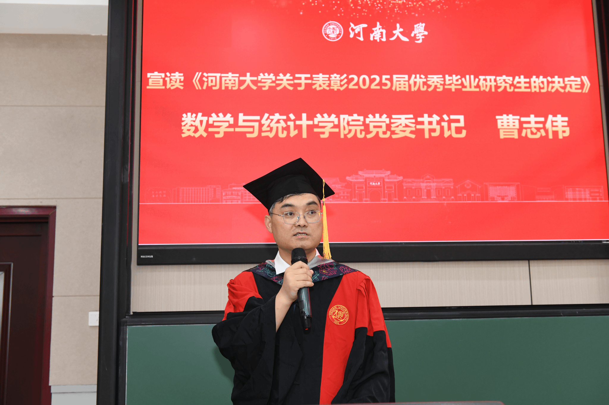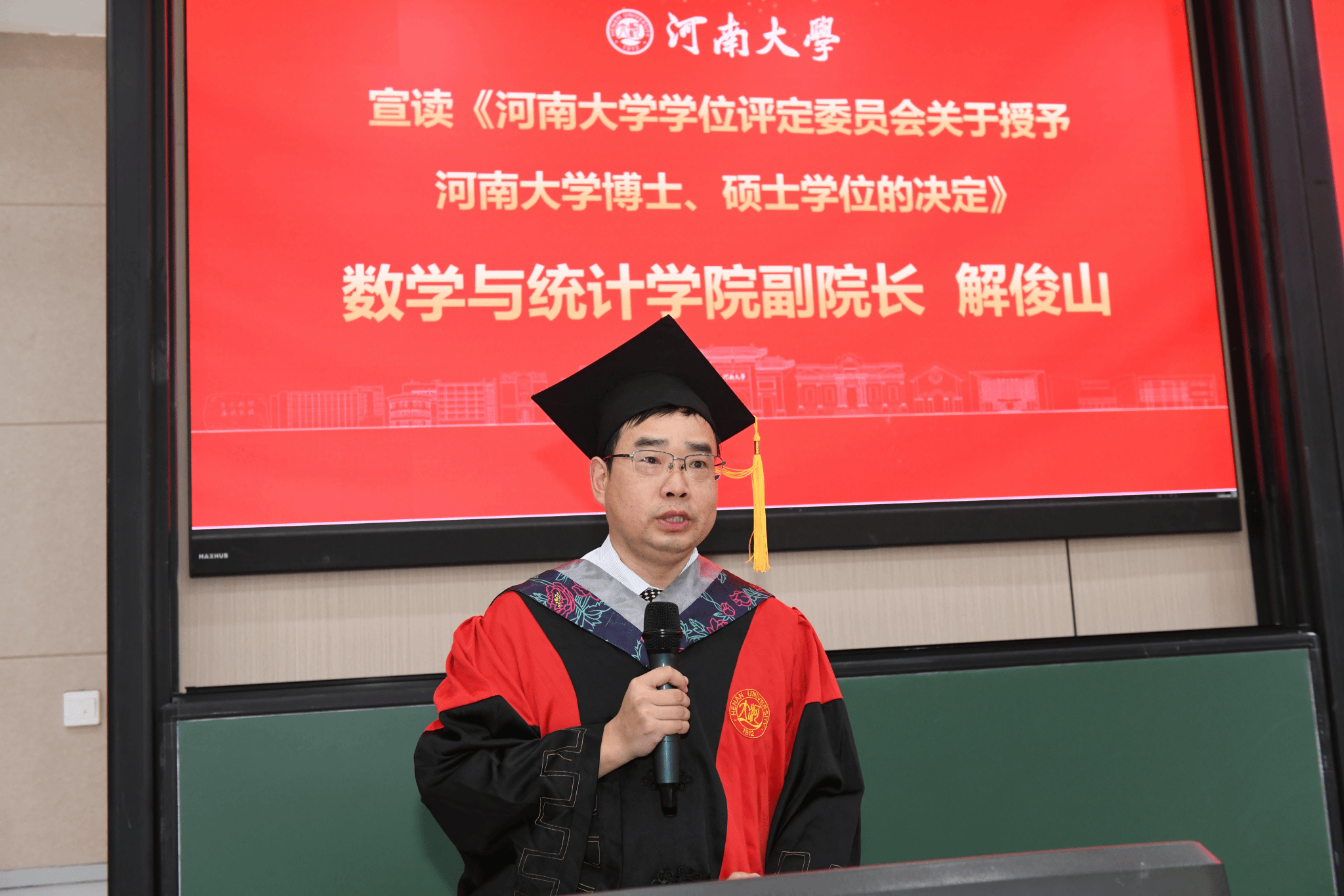 院党委书记曹志伟宣读了《河南大学关于表彰2025届优秀毕业研究生的决定》,对获得表彰的同学表示祝贺并勉励他们再创佳绩。副院长解俊山宣读了《河南大学学位评定委员会关于授予河南大学博士、硕士学位的决定》。