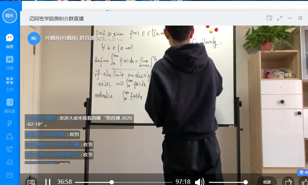 中外合作办学的《微积分》双语课程,为了保持双语教学的延续性,他就自己想办法购置了教学白板,借助钉钉平台进行直播教学。学生普遍认为教学效果良好,“看的清楚,也听的清楚,不用抢座位,不明白的地方还可以多次回放观看”。