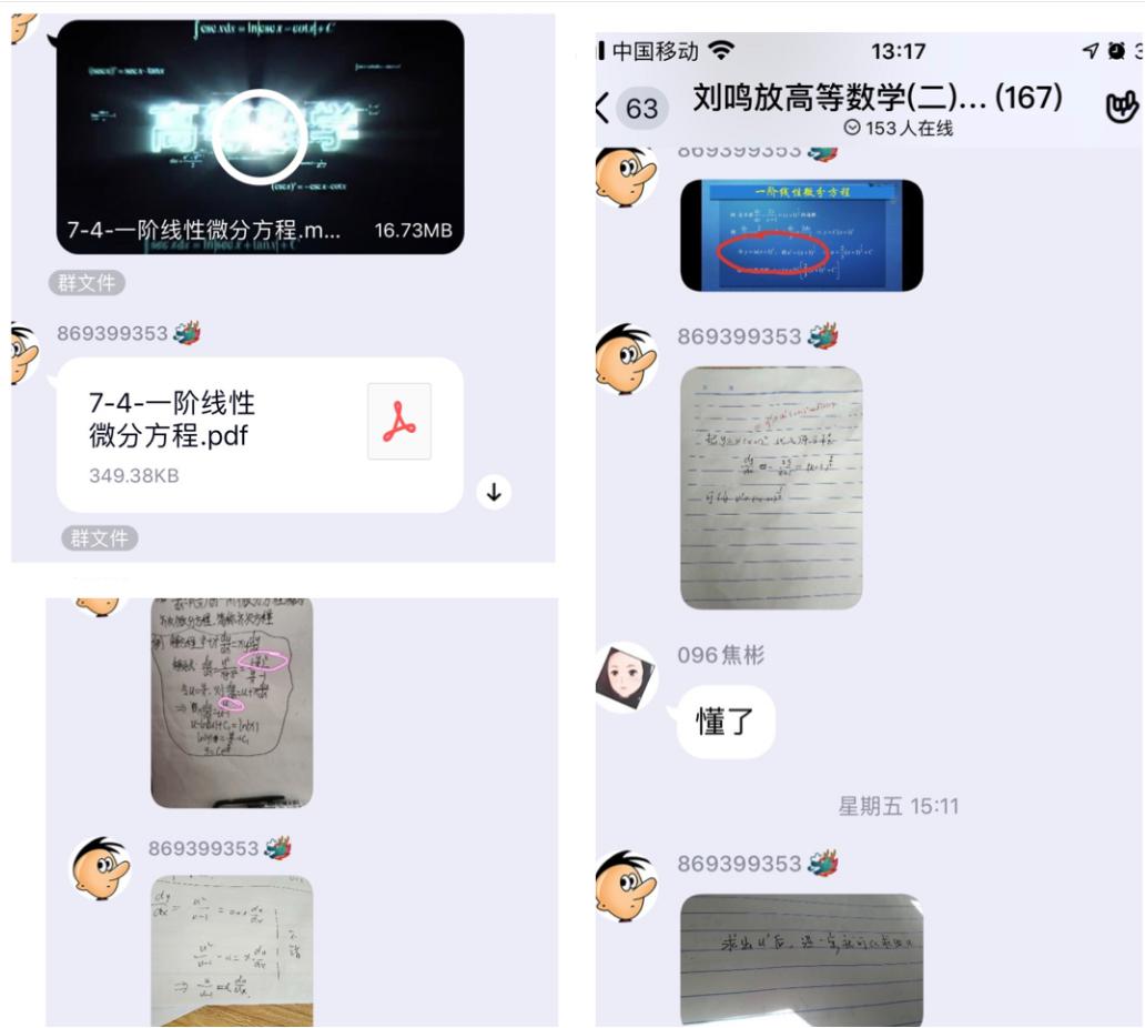 史宝丽老师因身边设备所限,不具体在线直播条件,采用QQ群在线教学方式,学生在QQ群中接龙签到,老师通过手写板书,手机拍照,然后语音讲解,并和学生互动答疑,并利用QQ群布置作业。由于学生较多,通常全天时间都会回答学生疑问,也取得了不错的教学效果。