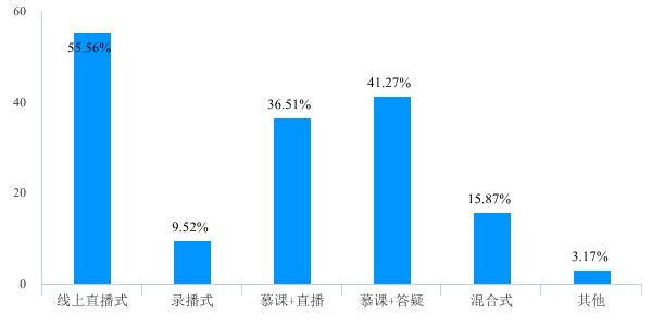 对于教学方式的选择方面(多选题),选择线上直播式的老师占55.56%,选择慕课加直播或者混合式占52.38%,选择慕课答疑的占41.27%,其他方式的占3.17%。说明大多数老师选择的是线上直播,随着spbo即时比分手机
