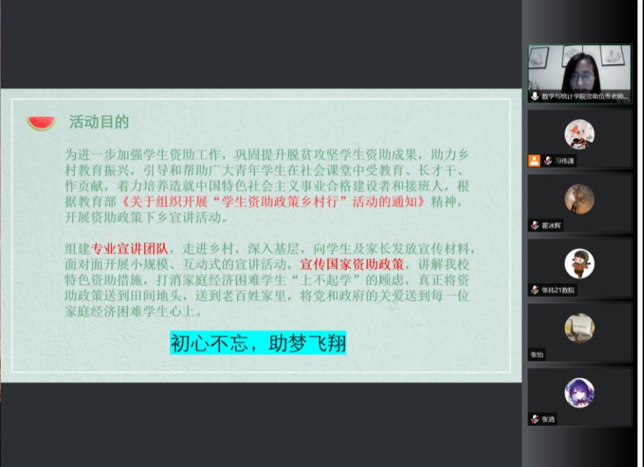 资助工作负责老师贾丽冰开展了以“初心不忘,助梦飞翔”为主题的“资助政策乡村行”线上启动会,她就宣讲活动的目的、资助政策的宣传内容、活动形式等方面给13名宣讲成员进行了简要说明,鼓励他们积极开展宣传,帮助更多家庭经济困难的学生了解国家资助政策。