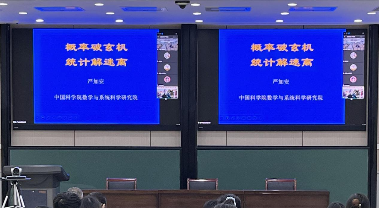 报告中,严加安院士通过“生日问题”、敏感性社会调查设计、评估疾病诊断的确诊率、“辛普森悖论”、“统计平均”的陷阱、“竞赛规则”、凯利公式等14个生动有趣的例子,深入浅出地阐述了概率统计学科中的重要思想,展示了生活中概率统计的应用魅力。严院士将他长期从事概率论研究的体会,对概率统计学科本质的一些领悟概括为一首“悟道诗”:随机非随意,概率破玄机。无序隐有序,统计解迷离。