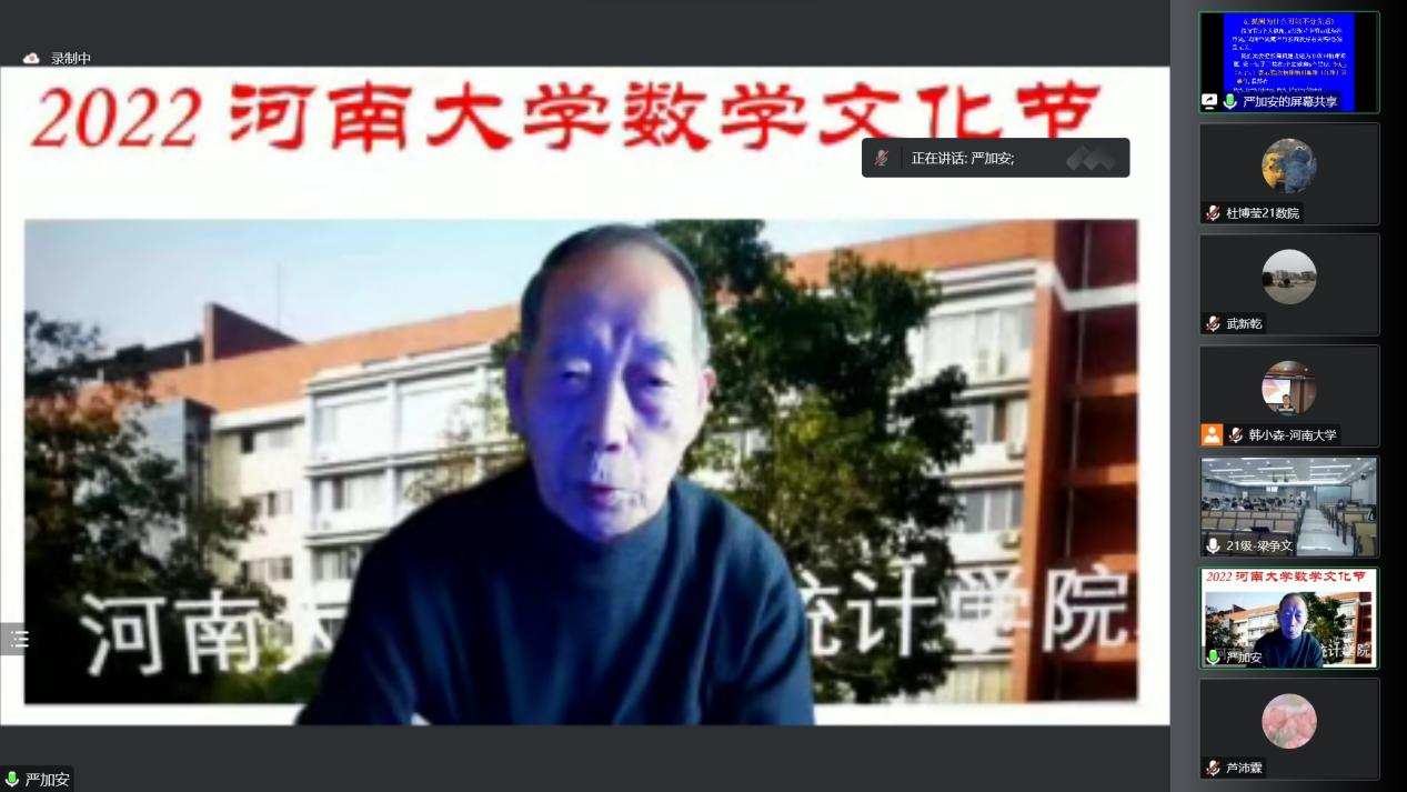 举办的综合性数学文化活动,每年一届,现已连续举办十三届。数学文化节旨在推动数学文化的传播和普及,培养学生求实、求真、求美的精神,增强学生创新与创造能力。数学大家的科普报告是文化节的重要环节之一,严加安院士此次的报告为同学们展示了数学的独特魅力,激发了同学们学习研究数学的热情。