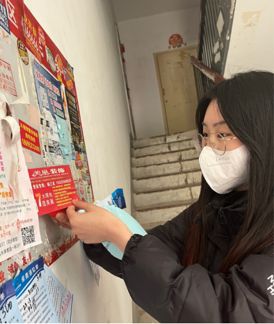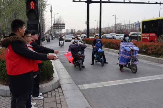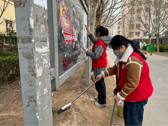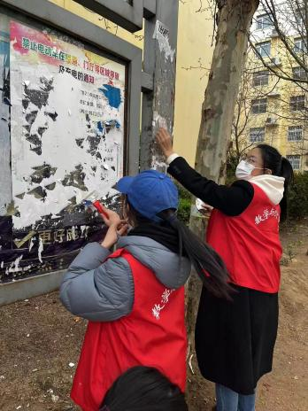 志愿者们身着红色马甲,手持小红旗、小铲子、环保袋,分成两组。男生组协助指挥学校北门十字路口非机动车辆的交通,对随意横穿道路、闯红灯、逆向行驶、骑乘电动车不佩戴安全头盔等违法行为进行劝导,呼吁大家遵守交通规则,安全出行、文明出行。女生组分工有序,对河南大学21号家属院内墙面、楼道、电线杆等处的小广告进行逐一清理;经过两个小时的劳动,小区内面貌焕然一新,她们忙碌的身影,成了小区里一道亮丽的风景线;通过劳动,同学们的文明意识、环保意识进一步增强。