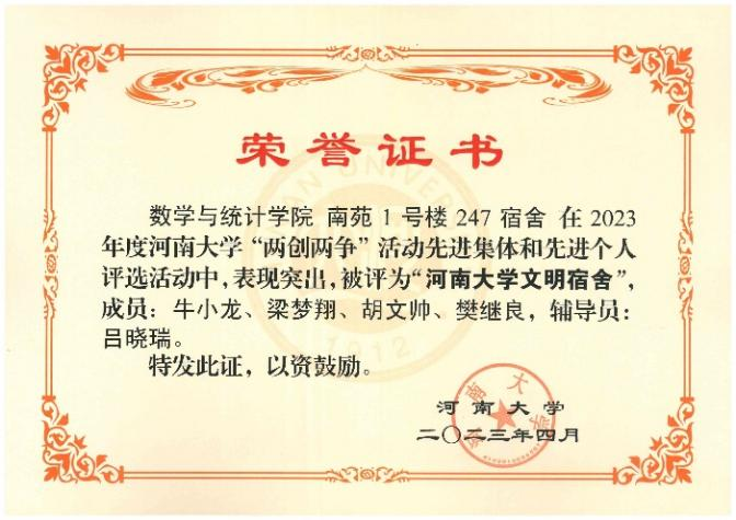 入学以来,247宿舍成员都秉承着“明德新民,止于至善”的校训和“团结勤奋,严谨朴实“的学风,勤奋学习,共同进步。学习专业课,看论文、讲讨论班、参与科研任务成为了他们的日常。四人彼此鞭策着,争先恐后地努力着,比学赶超的氛围让他们不断向上,在知识领域上持续取得新的进步。宿舍四人多次获得河南大学研究生一等学业奖学金。