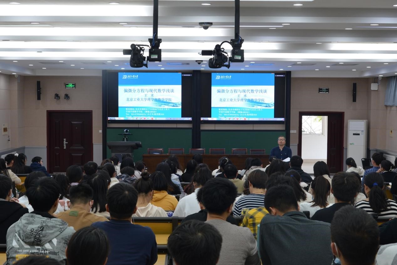 11月25日下午,我院于南阶梯教室举办了“高顿杯”数学文化节系列活动之校友论坛— “偏微分方程与现代数学浅谈”科普报告。北京工业大学教授王术老师向同学们介绍了偏微分方程的发展历史,讲解了数学建模的基本过程和方法,阐述了应用数学对现代数学发展的重要性,并强调偏微分方程在现代数学发展中的重要地位,增加同学们对偏微分方程的认识与理解,提高了他们学习和研究数学的兴趣。