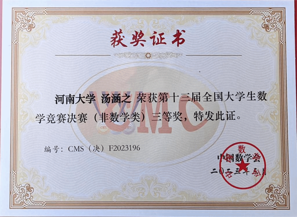 2019级金融数学专业汤涵之荣获非数学专业组三等奖。