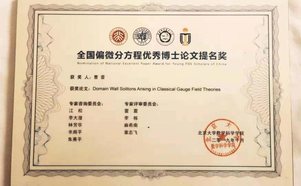 2017级博士生曹蕾(导师为杨亦松教授)受邀参加了此次论坛,获得全国偏微分方程优秀博士论文提名奖。