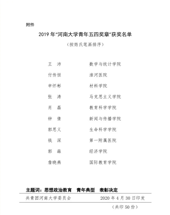 推荐并由共青团河南大学委员会评定后,共青团河南大学委员会于4月30日公布了2019年度五四表彰名单,spbo即时比分手机