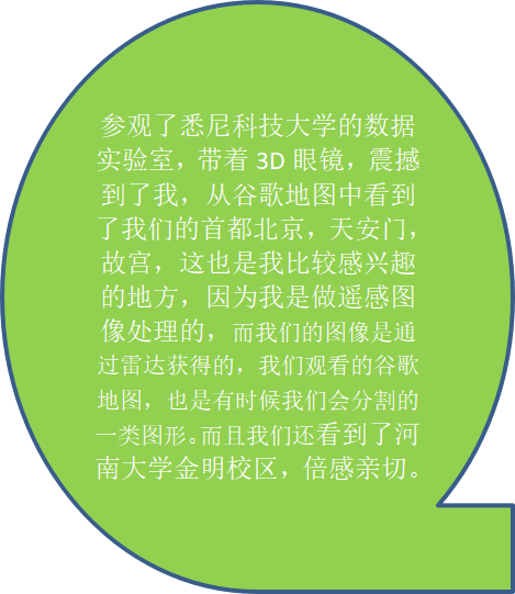 将近两天的悉尼之行,虽然我对这个城市并没有深刻的了解,但在学校的学习生活却是我受益良多。帅气的外教老师给我们普及了留学的相关知识,让我对出国产生了渴望。轻松地课堂范围也是我一直向往的。学生在课堂上自由发言,大胆说出自己的想法,思维没有受到限制,想象力会越来越丰富。一位会说中文的统计学老师对我而言是非常亲切的,让我对大数据有了更加深刻的认识。以前只是知道大数据很火热,但未深究其原因。科技的进步推动了大数据的发展。对数据实验室的参观让我了解了谷歌地图的强大。在遥远的悉尼,我看到了美丽的河南大学是原来不敢想象的。真的是开阔了自己的眼界,而且丰富了自己的知识。认识到自己的很多不足,比如需要恶补的英语以及狭窄的知识面。也激励自己努力学习英语。
