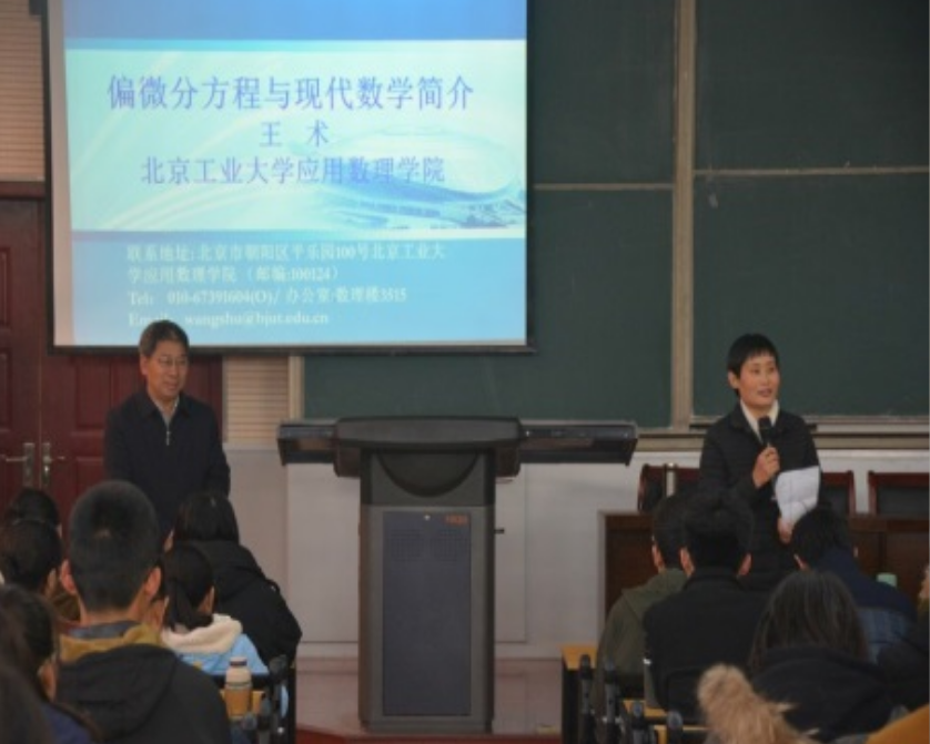 11月30日下午两点半,河南大学“智游杯”数学文化节之校友论坛系列报告在我院北阶梯教室举行。北京工业大学数学一级学科博士学位授予点责任教授、我校86级校友王术教授做了题为“偏微分方程与现代数学简介”的报告,院长冯淑霞主持报告会。