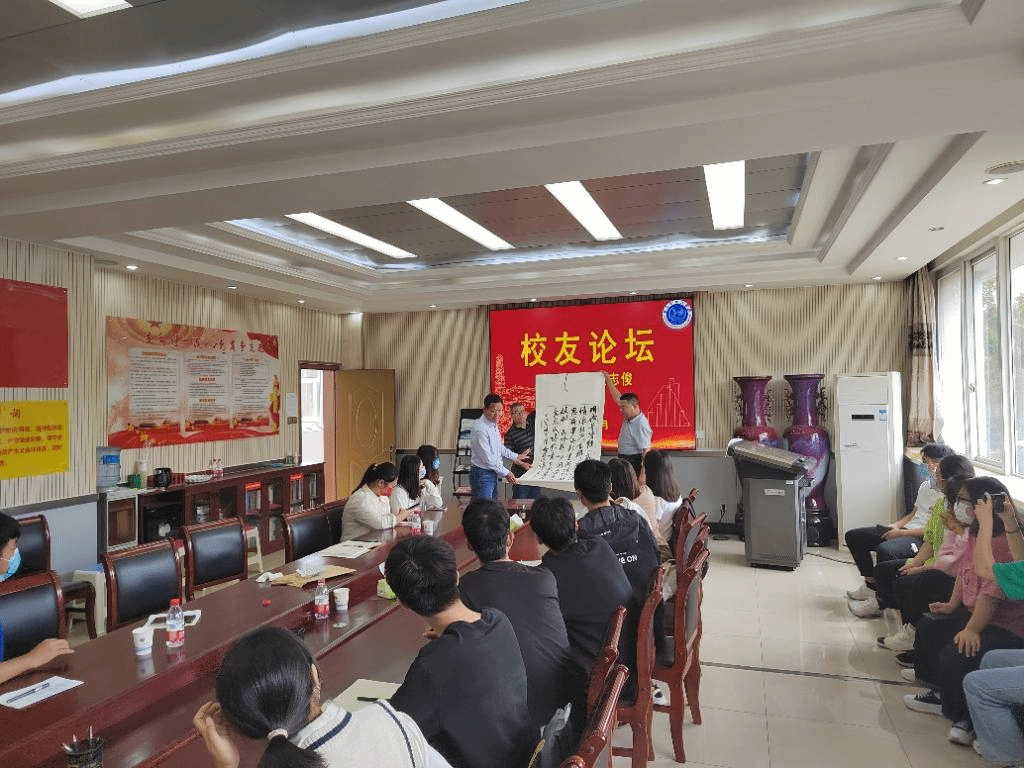 赠送亲笔诗词书法一副,忆读书生活,展报国情怀,勉励学弟学妹们能够劈波斩浪、携梦前行。