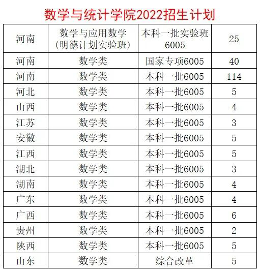 数学与应用数学(明德计划实验班)自2014年开始举办,2022年开始,将通过高招直接录取。实验班实行单独的培养方案,实施小班授课制、班主任和导师制、成员流动机制、研究生打通培养、国际名师授课等特色化的人才培养模式和学生管理模式,注重培养一批在数学或数学交叉领域有远大发展前途的一流拔尖创新人才,为培养根植中原地区的数学大师做准备。