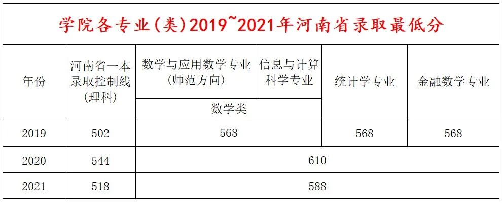 开设有数学与应用数学(师范方向)、数学与应用数学(明德计划实验班)、信息与计算科学、统计学、金融数学四个本科专业。其中,数学与应用数学专业为国家级一流本科专业建设点、河南省专业综合改革试点专业,统计学、金融数学专业为国家级一流本科专业建设点,信息与计算科学专业为河南省一流本科专业建设点、河南省特色专业。