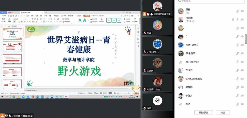 2021级本科生云上举办“世界艾滋病日——青春健康”主题活动。2021级辅导员梁争文老师以及学生代表参加活动。此次活动由2021级数学与应用数学专业习伟潇主持。